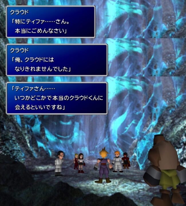 ティファがクラウドを信じられない(あるいは肯定できない)ことが、クラウドが精神崩壊を起こす“呼び水”となることも事実ですので、ティファにとっては相当堪えるに違いない。