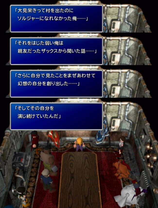 物語後半にクラウドが復帰した後、ニブルヘイムにある神羅屋敷の地下に行くと、クラウドによる回想シーンが始まります。