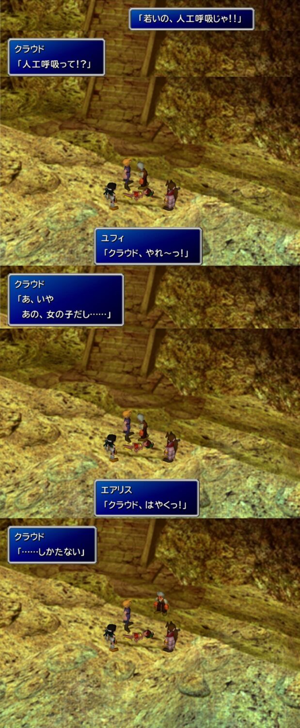 何れにしても、クラウドにとって異性への人工呼吸(=唇と唇の接触)は重大な意味を持つ行為であったことは間違ありません。