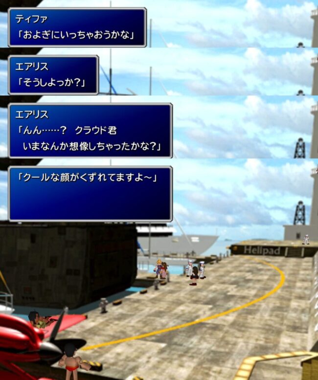 このイベント時にエアリスが来ると、エアリスがクラウドにデート経験の有無について尋ねます。
